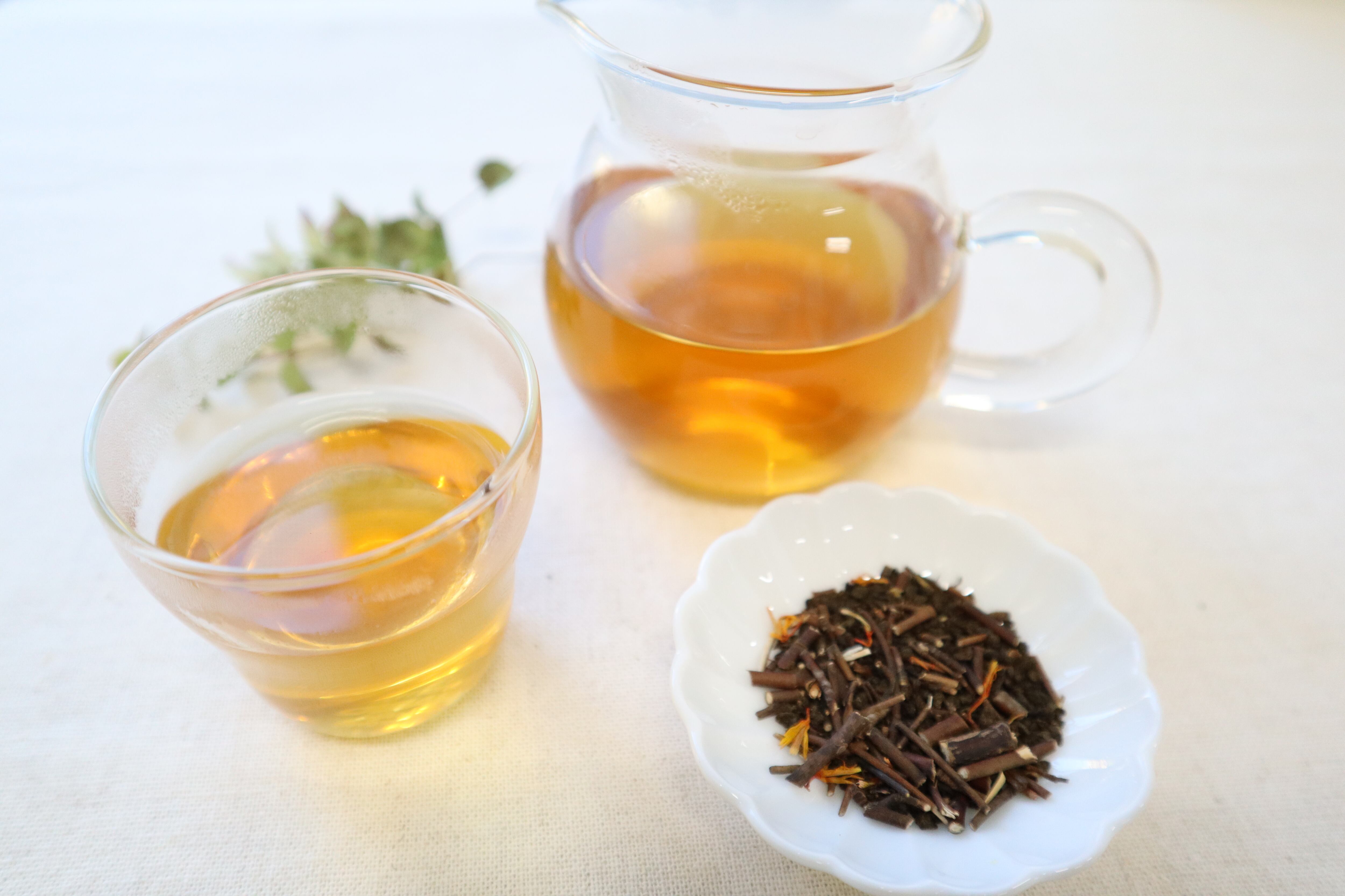 カロリーゼロですから、寝る前に飲んでも安心ですね。茎茶を焙じた軽い味わいの香ばしさに、和のハーブが連なる美味を存分に楽しんでいただけます。
